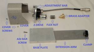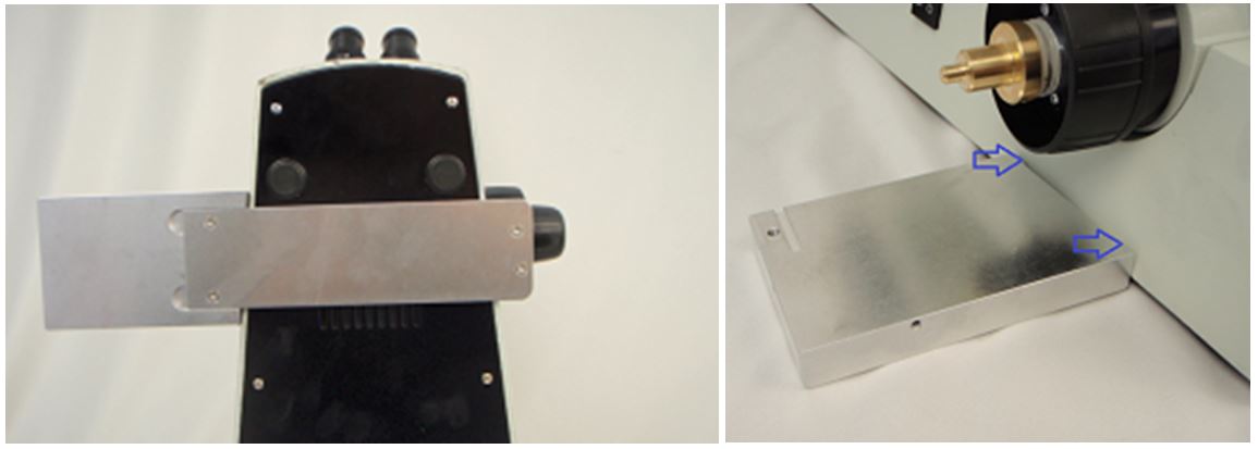Loosen the baseplate clamp and adjust the base plate so that the hole on the screw hole on the baseplate is in the center of the slot on the adjustment arm that the adjustment bar screw goes into. Tighten the baseplate clamp to secure the baseplate to the microscope. Install and lightly tighten the Adjustment bar screw.