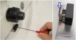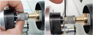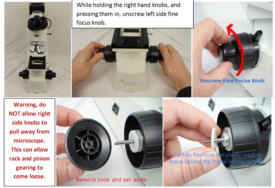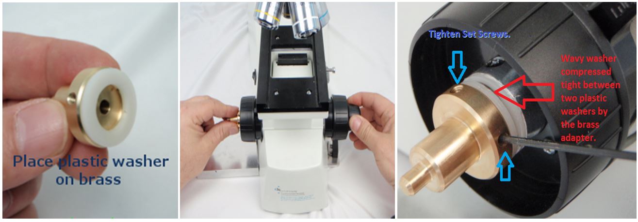 You will need to remove the left fine focus knob by holding the course and fine focus knobs on the right and unscrewing the left hand fine focus knobs. BE CAREFUL not to allow the right hand knobs to pull out from the microscope – they must stay firmly pressed in at all times. Once the knob is removed locate the plastic washer – if it is loose attach it to the brass knob (there should be a sticky lubricant on the washer). Finally, while holding both right knobs firmly in the microscope, screw the brass adapter onto the fine focus shaft till the plastic washer is firmly up against the wavey washer. Use a () hex wrench to tighten the two set screws on the brass adapter.