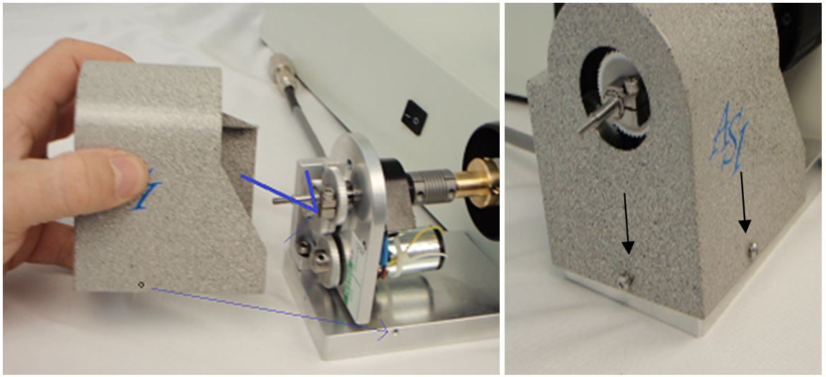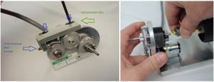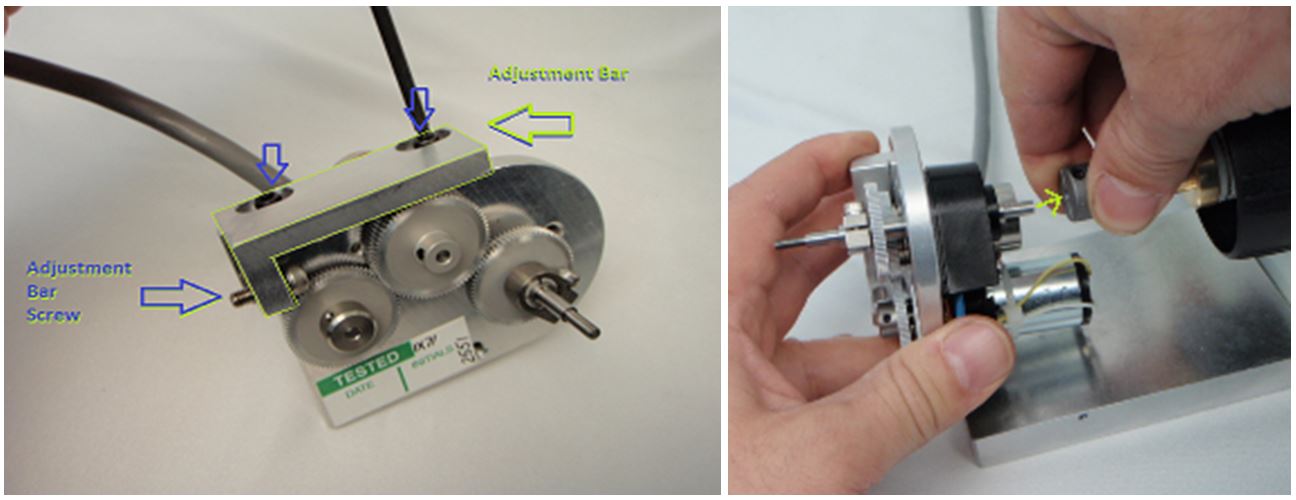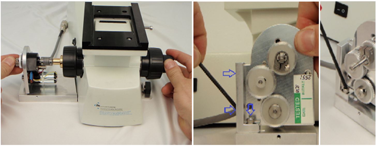 Ensure the three screws on the adjustment bar are slightly loose. Grabbing the and turning the knob on the right hand side of the microscope, adjust and align the position of the drive on the baseplate so that there is the least amount of friction. The flex coupler should stay straight and not flex when you are turning the knob. When the best alignment position is found, tighten all three screws on the adjustment bar. Ensure that the screws on the flex nut are tight enough that there is no slippage – all adjustment bar screws are tight – that when you turn the fine focus knob there is no friction from misalignment of the shafts and the flex nut.