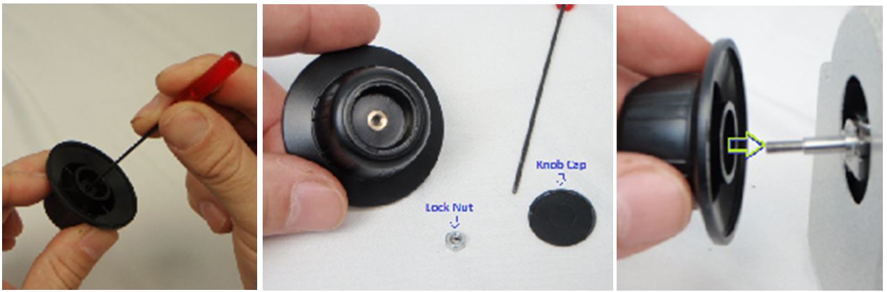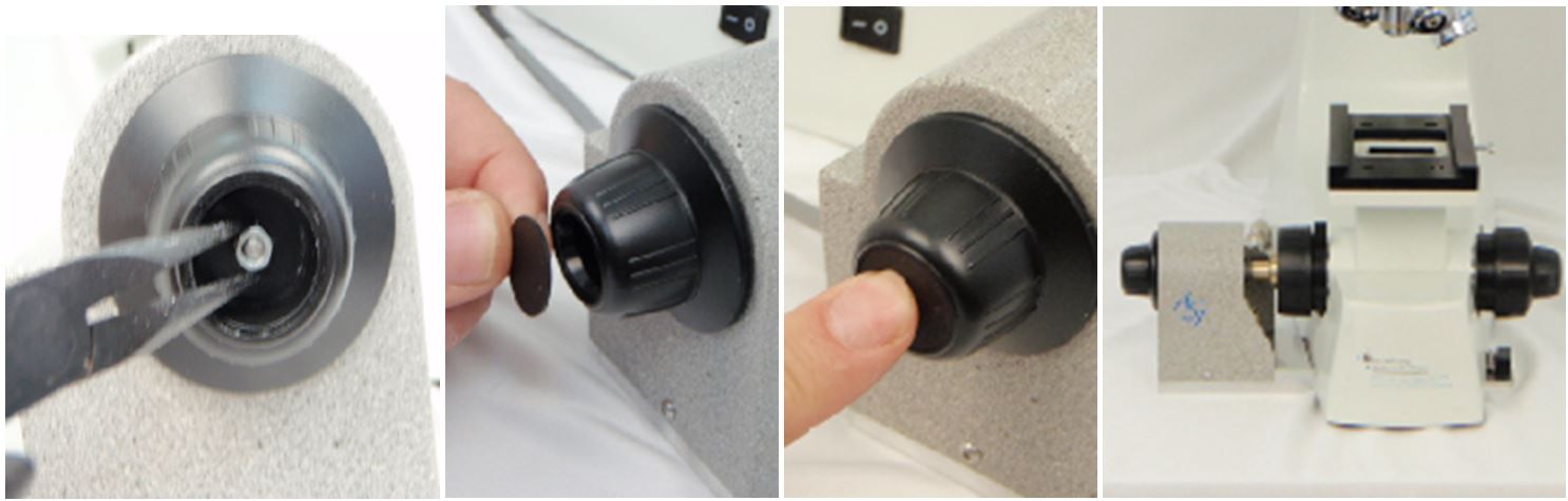 If you hear a rattle when shaking the knob. Take a hex wrench or screwdriver and gently push till the knob cap pops off releasing the lock nut that is trapped inside. (Note some knobs may not have a lock nut, if there is no rattle, just screw on the knob. While holding the fine focus knob on the right side of the microscope, slide the knob on to the drive shaft that is protruding from the cover and screw it on till it stops, or just short of it rubbing against the cover. Using a tool like needle nose pliers, screw on the lock nut (if you have one). Finally tap on the knob cap till its secure in place. The Z-Drive is installed!