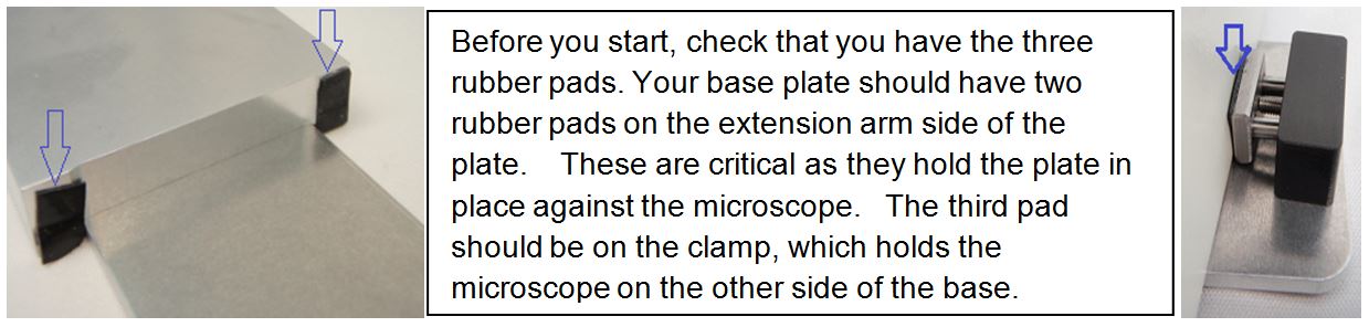Use a 1.5mm hex wrench to tighten the clamp so that the base plate grips the microscope between the two rubber pads on the left and the clamp rubber stamp on the right. Note, you may have to loosen the clamp and adjust the baseplate position later when you attach the drive unit to the base plate.