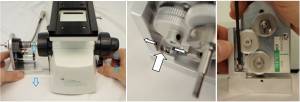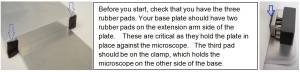 Slide the baseplate under the microscope till it stops in place roughly just under the focus knobs. The two rubber stops should be snug against the microscope.