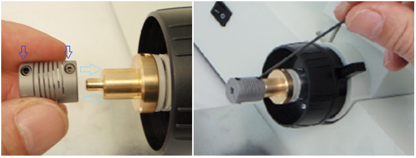 Slide the flex nut on the brass adapter so that the tightening screws face forward. Tighten the right screw on the flex coupler enough to make it stay on the brass adapter post. Note: you may need to loosen and adjust this to get the flex coupler evenly on between the brass adapter and the z-drive shaft.