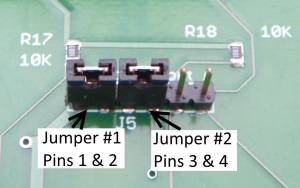Note: While looking at the controller from the front, from left to right across J5, pins 1&2 are Jumper #1, and pins 3&4 are Jumper #2. The last two pins (the ones on the far right) are test pins and should never have jumpers attached to them.
