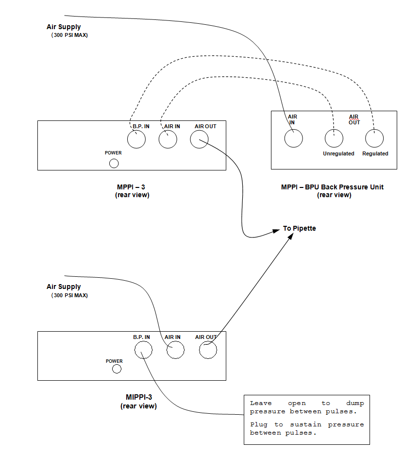 Note: If the Back Pressure Unit (BPU) is used, then, between pulses, you will have back pressure at the pipette tip that is equal to the pressure setting on the BPU 0-to-15 psi (0-to-100 kPa).