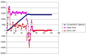 As you can see, without any feedback, (blue diamonds, AA=1 case) there is a substantial region where supplying a commanded speed to the motor results in no motion whatsoever. The PID loop can overcome this non-linearity and still provide accurate positioning, but the dead zone will give rise to “wind-up” and overshoot in a feedback loop that is well-tuned for the constant slope section of the transfer curve. Increasing the feedback (larger AA number) reduces the size of the dead region and significantly “linearizes” the transfer function near zero. Not surprisingly, problems associated with poor drive card alignment show up when the motors need to move slowly, e.g. when completing a move.