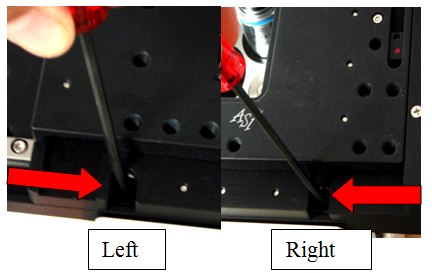 Remove any protective stage shipping bolts or brackets. Mount the stage with the new screws supplied with the ASI stage. Slide the stage onto the microscope with the connector to the right, and the Y-axis lead screw to the right. Align the screw holes on the front and rear of the stage with the holes located on the microscope. On some flat top stages (as seen in Figures 1a and 1b), the screw holes are not visible until the stage is moved under power to the left and right on the X-axis. This requires that part 3 be completed first. Next, secure the stage with the center top screw. Move the stage to the right until the screw hole on the left is visible and secure the stage to the microscope with the supplied screw and Allen wrench. Repeat with the left motion and with the attachment of the right screw.