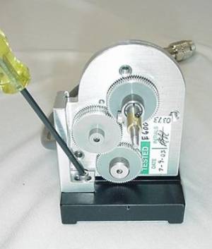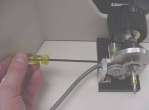 b) Slide the microscope fine focus knob over the shaft extension and press it all the way on so that the plastic tabs on the knob mate with the slots on the ASI drive shaft. Install the small round nut in the end of the fine focus knob and tighten it with the medium slotted screwdriver. Slide the black rubber boot over the fine focus knob.