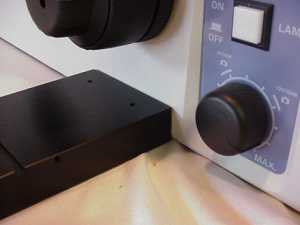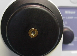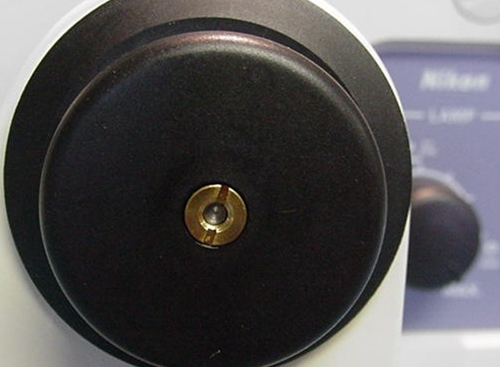 Pull off the rubber boot from the end of the left fine focus knob to expose the nut shown in figure 1. Use screwdriver to remove this nut. Pull knob straight off to expose brass adapter plate as shown in figure 2.