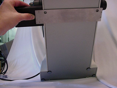 Locate the baseplate. If the motor drive is attached to the base plate use the 3mm Allen wrench to remove the horizontal adjustment screw to remove the drive from the base plate. Position the base plate so that the large baseplate is on the left side of the microscope. Lift the front of the microscope up and slide the baseplate under the microscope so that the horizontal adjustment bar is centered under the left focus knob as shown in figure # 3. There are two clearance holes, as shown in figure # 4, for two screws on the bottom of the microscope ( TE200 / 300 series ). When the baseplate is “about” in the correct position you will feel the screw drop into the holes. Leave the clamp shown in figure # 5 loose at this time.