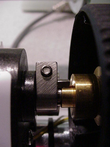 Figure 7 Install Z-drive over fine focus shaft, and insure that tab on the end of the clamp goes into the slot on the brass piece, or white gear. Hold the clamp firmly against on the brass piece, or white gear, and use the 7/64” Allen wrench to tighten the clamp as shown in figure 8.