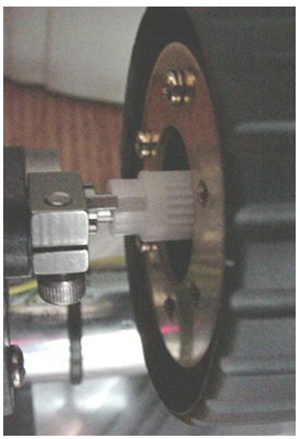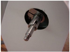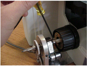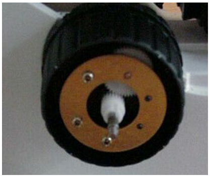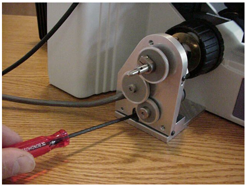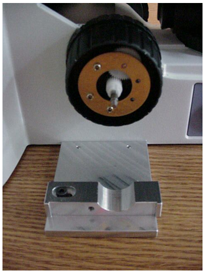 b) Slide the microscope fine focus knob over the shaft extension and press it on all the way so that the plastic tabs on the knob mate with the slots on the ASI drive shaft. Install the small round nut in the end of the fine focus knob and tighten it with the medium slotted screwdriver. Slide the black rubber boot over the fine focus knob.