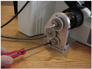 b) Locate the ASI fine focus motor drive and vertical adjustment screw (M4 x 12 hex head screw).Align the drive shaft on the ASI drive with the microscope fine focus shaft and slide the motor drive over the fine focus shaft.