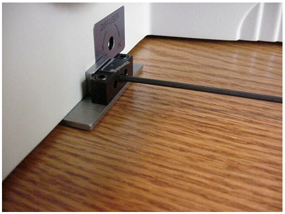 a) Loosen the screw securing the adjustment bar to the baseplate. This is the horizontal adjustment screw. The adjustment bar is located just to the left of the left focus knob. Use the 3 mm hex wrench. Loosen the screw just enough so that the adjustment bar can slide easily in the groove in the baseplate.