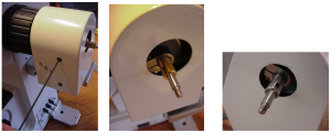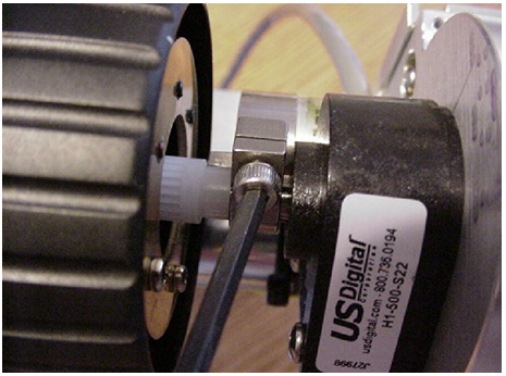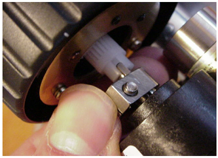 Locate the cover and install it on the drive as shown using the Allen wrench and the supplied screws that are in the drive plate. Before tightening the screws make sure the cover is positioned so that it does not rub against the outer clamp as shown. Once the cover has been installed the original knob can be installed onto the protruding shaft. Note that the slots on the shaft mate with the plastic tabs on the knob.