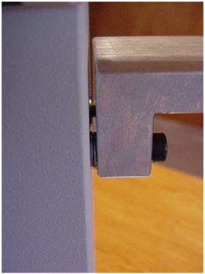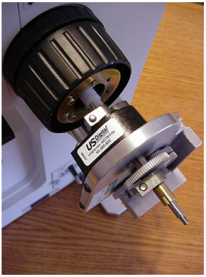 b) Slide the microscope fine focus knob over the shaft extension and press it on all the way so that the plastic tabs on the knob mate with the slots on the ASI drive shaft. Install the small round nut in the end of the fine focus knob and tighten it with the medium slotted screwdriver. Slide the black rubber boot over the fine focus knob. Refer to figure 1 if necessary.