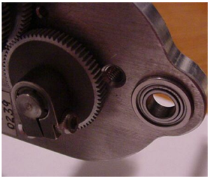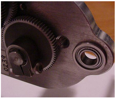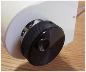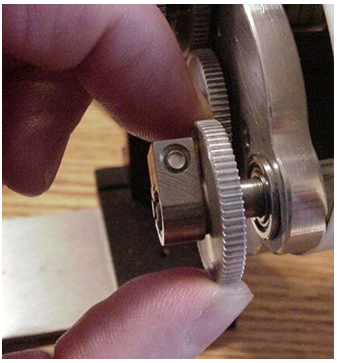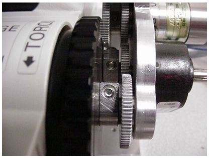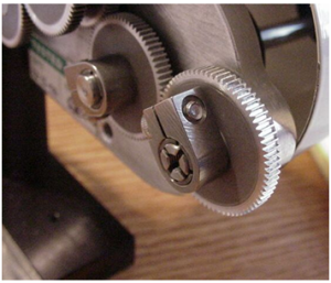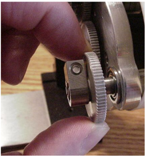 After completely screwing the ASI cover on to the microscope fine focus shaft as shown locate the ASI drive gear, this may be on the ASI drive and will need to be removed from the drive as shown. Loosen the screw on the clamp, and screw it onto the threaded part of the shaft. Insure that the clamp is lose before you try to screw it on. Screw the shaft all of the way onto the microscope then press the gear completely against the microscope / ASI cover. Use the 7/64” Allen wrench to securely tighten the clamp, thus securing the complete assembly onto the microscope.