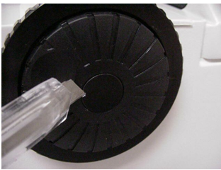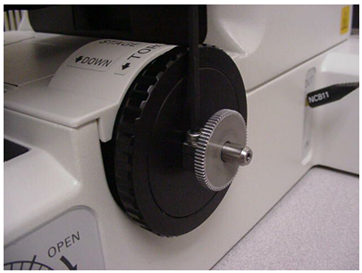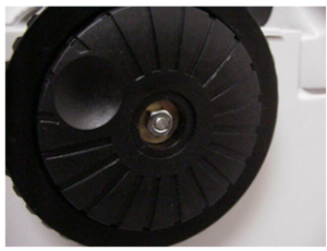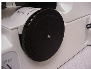 As shown in the above photos use the small knife, or sharp instrument, to pry off the small round black cover located in the middle of the right fine focus knob. Use the 7/32 or 5.5mm driver wrench to remove the nut that is located in the center of the fine focus knob. It will be necessary to hold the left fine focus knob when removing this nut to keep the fine focus shaft from turning.