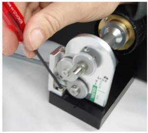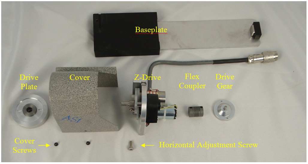 1. If shipped assembled, use the 3 mm hex wrench and disassemble the Z-drive motor assembly from base plate by removing the horizontal adjustment screw. At this time, also loosen the two vertical adjustment screws.