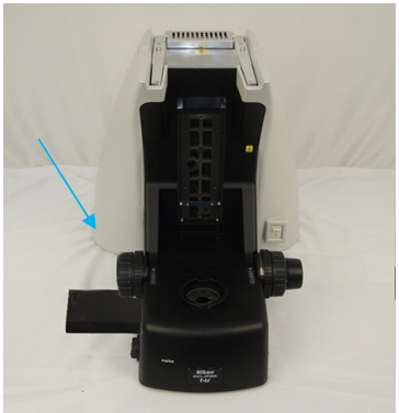 2. Slide the baseplate assembly completely under the microscope as shown until the small stop plate located on the baseplate is completely against the side of the microscope. This stop plate should be parallel with the bottom of the microscope. Align the plate beneath the focus knobs.