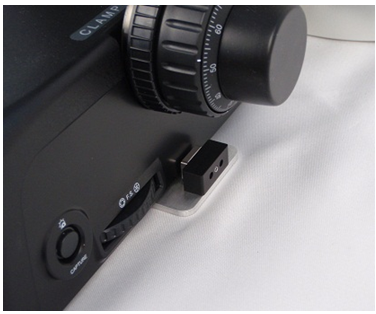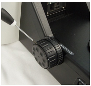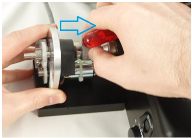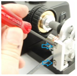 1. Using a flathead screwdriver, carefully pry off the fine focus knob off the Left side of the microscope. The knob is held on by a magnetic clamp which should release with a little amount of pressure.