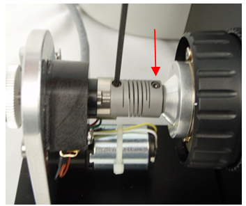 7. Tighten the clamp of the flexible coupler onto the drive shaft of the Z-drive unit using the 2mm hex wrench. Note: The flexible coupler clamp must be securely tightened or the drive may slip.   8. Lightly tighten the vertical and horizontal adjustment screws as shown. Since the motor is usually self-aligning, this should be a good position for the drive. Check the alignment by noting the drag while rotating the right-hand fine focus knob. No noticeable drag should be felt for the full 360º rotation of the fine focus knob. If any drag is felt other than the slight drag of the gears, loosen the vertical and horizontal adjustment screws and move the drive to a point where no drag is felt. Then tighten the vertical and horizontal adjustment screws.