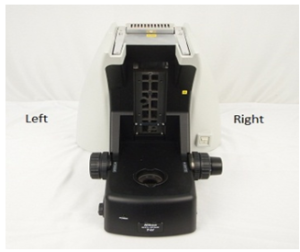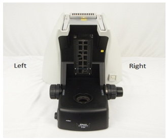 The terms ‘left’ and ‘right’ refer to the sides of the microscope as viewed from the front of the microscope.