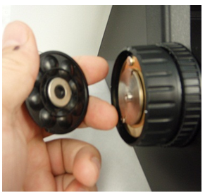 1. While holding the right hand knob in place, press the coupler on firmly so that the coupler is all the way on. Ensure that it is pressed against the Drive Gear without pushing the right focus knob out on the other side.
