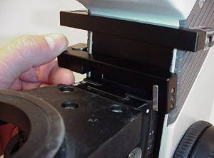 After correctly installing and aligning the encoder move the stage up towards the objective so that the encoder’s plunger is fully depressed. Then tighten the microscope’s clamp adjustment as outlined in the microscopes manual to insure that the microscope stage can not be moved past the upward travel limit of the encoder.