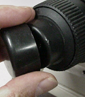 As shown in the above photos remove the rubber boot off of the left focus knob to expose the small slotted nut. Use the screwdriver to remove this nut, and then pull the knob straight off as shown. Do not twist the knob while removing it; insure that you pull the knob straight off, as there are small plastic alignment tabs on it that can be easily damaged by twisting the knob.