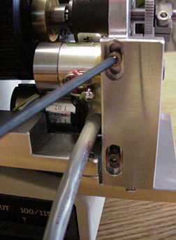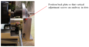 After installing & securing the drive to the focus shaft of the microscope the back plate can be positioned and secured. Position the back plate to a point midway along the slots for the two vertical adjustment screws and secure it in place by tightening the set screw to depress the clamp on side of the microscope.