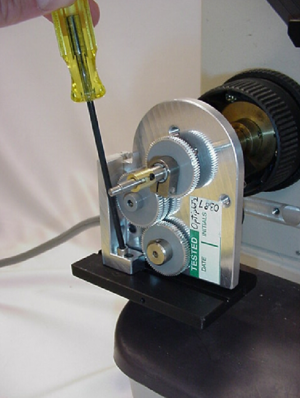 Press the drive onto the microscope until the side of the back plate assembly slides against the side of the microscope, or if installing the drive and back plate separately: push the drive on until the tab on the adjustment bar seats into the grove on the back plate. While holding the drive in place with one hand slide the tab that is extending from the drive clamp into one of the slots on the bass piece that is located on the microscope shaft. Hold this in place and use the 7/64 inch hex wrench to securely tighten the clamp. Note The Clamp Must Be Securely Tightened or the drive and clutch may slip.