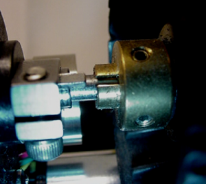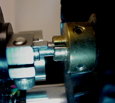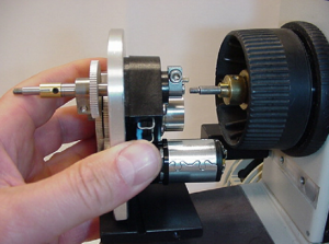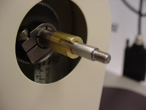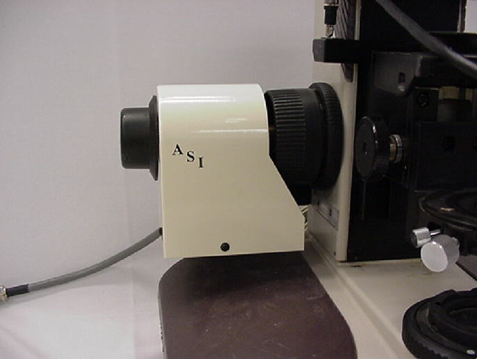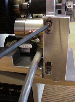 Use the 7/64 Allen wrench to loosen the clamp that is located on the ASI drive shaft. This clamp is located at the end of the drive shaft as it protrudes out of the black encoder cover. Once the clamp is loose slide it back towards the encoder. While holding the right fine focus knob slide the motor drive and back plate assembly in towards the microscope, when the ASI drive shaft is close enough, position the hollow end of the drive shaft (protruding from the black encoder) over the fine focus shaft on the microscope. Orient the motor assembly so that the two shafts are aligned, and then push the motor assembly onto the microscope. If you do not hold the right fine focus knob the microscope’s fine focus shaft may be pressed over towards the right of the microscope. If this happens simply push the right fine focus knob in towards the microscope to push the shaft back.