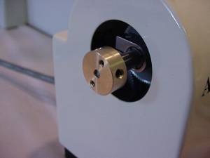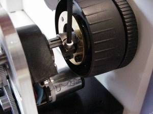 Slide the microscope brass knob adapter over the shaft extension and press it on all the way. Secure it in place by tightening the to set screws. Install the knob onto the brass adapter plate.