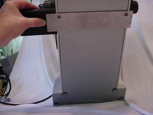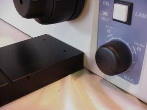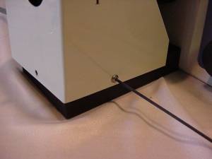 Locate the baseplate. If the motor drive is attached to the base plate use the 3mm Allen wrench to remove the horizontal adjustment screw to remove the drive from the base plate. Position the base plate so that the large baseplate is on the left side of the microscope. Lift the front of the microscope up and slide the baseplate under the microscope so that the horizontal adjustment bar is centered under the left focus knob as shown in figure # 3. There are two clearance holes, as shown in figure # 4, for two screws on the bottom of the microscope. When the baseplate is “about” in the correct position you will feel the screw drop into the holes. Leave the clamp shown in figure # 5 loose at this time.