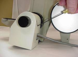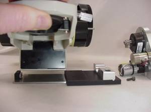 b) Please Note: That the horizontal adjustment screw that holds the adjustment bar to the base plate should be lose when installing the drive & the baseplate itself may need to be moved to properly center the adjustment bar and drive. Once the drive, base plate, and adjustment bar have been centered use the 7/64” Allen wrench to tighten the drive clamp as shown below in figure 8. Please note that the drive clamp should be pressed up against the microscope as shown & that it must be securely tightened to prevent slippage.