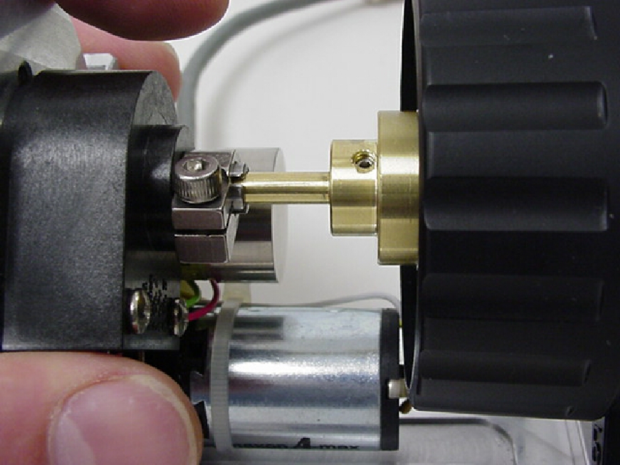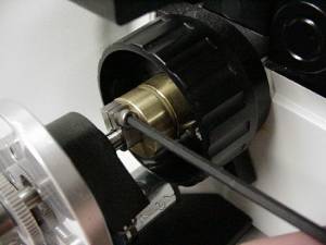 Locate the small brass clutch plate and screw it onto the fine focus shaft in place of the fine focus knob that was just removed. After the clutch plate has been completely screwed onto the fine focus shaft locate the ASI drive and use the 7/64” Allen wrench to loosen the two shaft clamps located near the black encoder case. Remove the outer shaft from the inner shaft; the outer shaft is threaded. Screw the outer shaft onto the fine focus shaft so that it presses against the brass clutch plate. Slide the clamp assembly against the brass clutch plate and tighten it with the 7/64” Allen wrench.