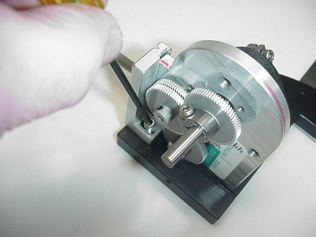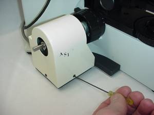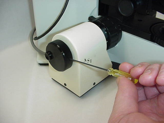 Use the 3mm or 7/64“ Allen wrench to screw in the horizontal adjustment screw but leave it loose enough so that the vertical adjustment bar assembly can slide within the grove. Use the 5/64 Allen wrench to tighten the setscrew located on the right side of the base plate. Tightening this setscrew will cause the silver clamp to press against the microscope and this will secure the base plate to the microscope. Use the 7/64 inch hex wrench to tighten the drive shaft clamp. This clamp is located on the drive shaft between the black encoder and the microscope. .