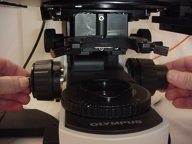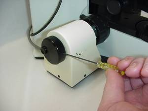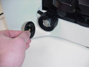 Firmly hold the right fine focus knob with your right hand and turn the left fine focus knob counter clockwise to unscrew it from the fine focus shaft.