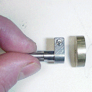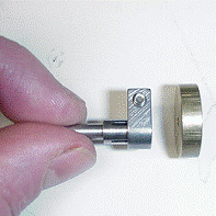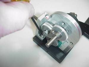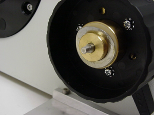 b) Slide the black microscope fine focus knob on to the shaft extension, positioning it so that one of the setscrews that secure it will mate with the flat on the shaft. Tighten the setscrews to secure the knob to the shaft.