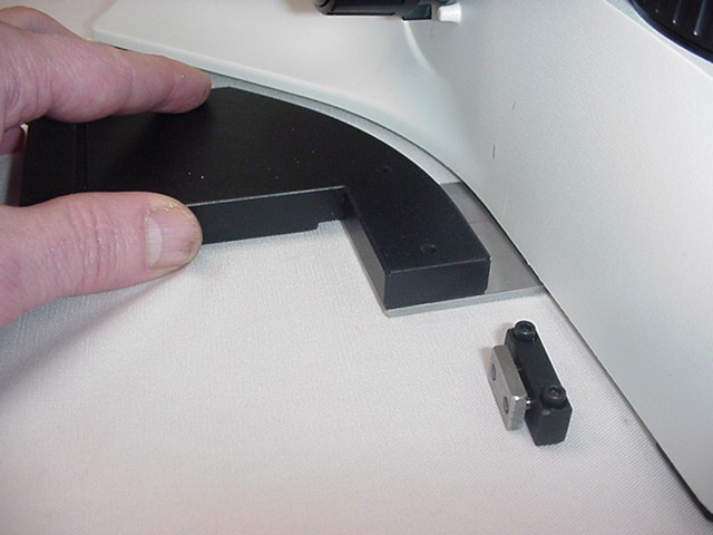 Locate the baseplate and remove the ASI drive from it if it is attached by using the 3mm Allen wrench to remove the Horizontal adjustment screw. Position the base plate assembly it so that the horizontal adjustment bar is on the left side of the microscope. Lift the front of the microscope up and slide the base plate under the microscope so that angled portion of the base plate is aligned with the contour of the microscope.