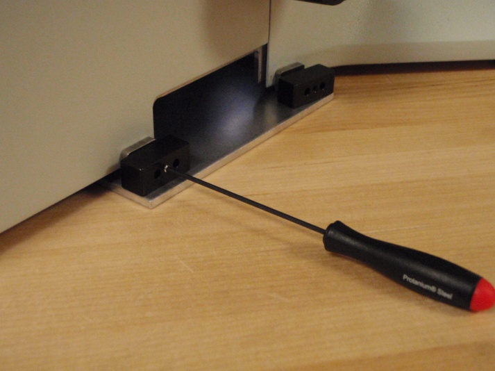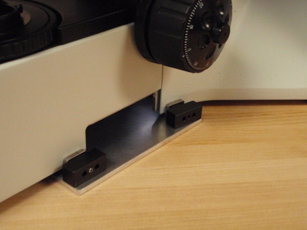 Locate the baseplate and remove the ASI drive from it if it is attached by using the 2.5 mm Allen wrench to remove the Horizontal adjustment screw. Position the base plate assembly it so that the horizontal adjustment bar is on the left side of the microscope. Lift the front of the microscope up and slide the base plate under the microscope so that angled portion of the base plate is aligned with the contour of the microscope.