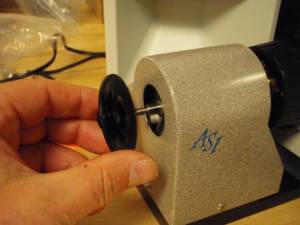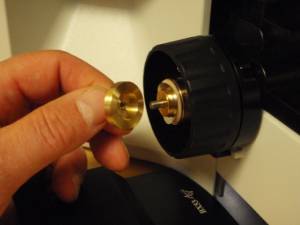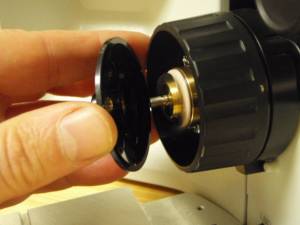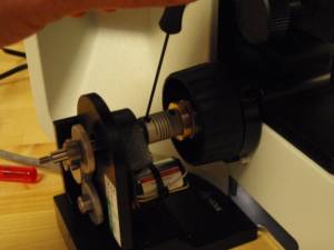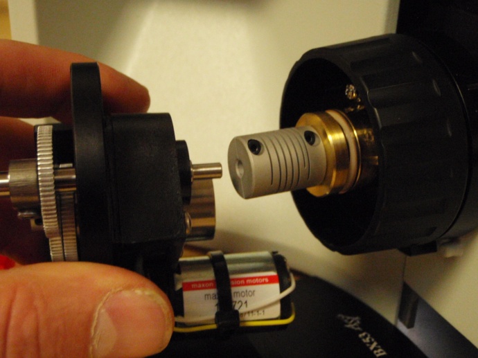 Locate the brass clutch plate and securely screw it on to the fine focus shaft. When installing the clutch insure that it is pressed all the way against the wave washer without pushing the right focus knob out at all. Check for any play in the focus shaft by pushing & pulling the right focus knob – there should be no play. Install the flex coupler as shown & fasten the flex coupler using a 1.5 mm Allen wrench.