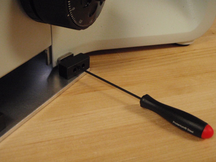 2. Slide the new black microscope fine focus knob over the shaft extension and press it on all the way. Use the 1/16” Allen wrench to tighten the setscrews to secure the knob on the shaft.