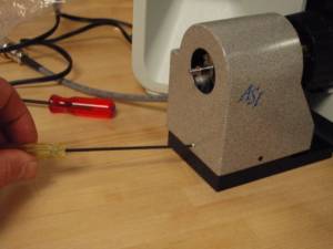 As shown in the above photos install the Z-drive onto the base plate by sliding the drive shaft into the flex coupler, and installing the horizontal adjustment screw that was removed in Part 2. Use the 2.5 mm Allen wrench to lightly tighten this screw. Leave it loose enough so that the vertical adjustment bar assembly can slide within the grove. Please note that the base plate may need to be moved slightly to align everything correctly. Use the 1.5 mm Allen wrench to securely tighten the flex coupler onto the ASI Z drive shaft. Please note that this screw must be securely tightened to prevent slippage.