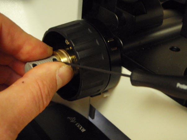 Remove the left fine focus knob from the microscope as follows: