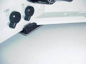 Locate the baseplate and remove the ASI drive from it (if it is attached) by using the 7/64” Allen wrench to remove the horizontal adjustment screw. Position the base plate assembly it so that the baseplate on the left side of the microscope. Lift the front of the microscope up and slide the base plate under the microscope so that angled portion of the base plate is aligned with the contour of the microscope as shown in figure 7. Hold the baseplate against the bottom of the microscope as shown in figure 8, and secure the baseplate in place by tightening the setcrew clamp shown in figure 9.