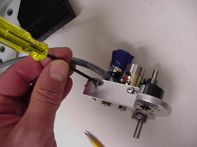 Locate the motor drive cover. Remove the 4/40 button head screws from the drive with the 1/16” Allen wrench. Position the motor drive cover over the motor drive assembly and secure in place using the 4/40 button head screws.
