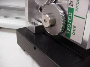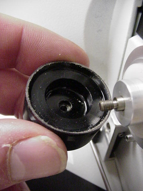 Slide the new black microscope fine focus knob over the shaft extension and press it on all the way. Use the 1/16” Allen wrench to tighten the setscrews to secure the knob on the shaft.