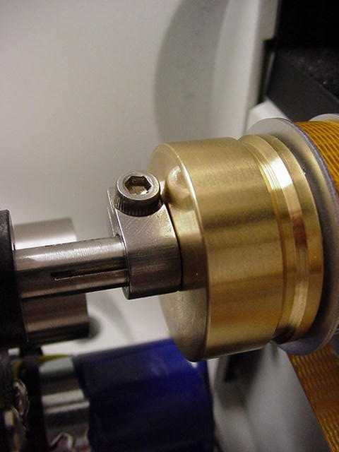 Press the clamp against the brass clutch plate as shown in figure 17, and use the 7/64-inch hex wrench to tighten the drive shaft clamp as shown in figure 18.